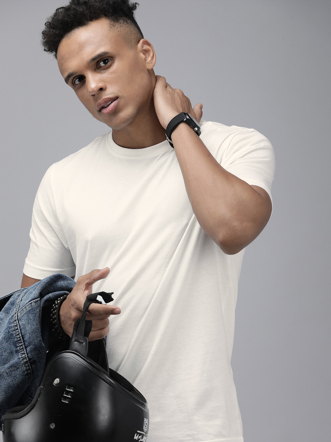 Roadster Men Off White Solid Pure Cotton T-shirt